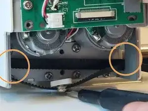 Используйте крестовую отвертку Phillips #1, чтобы снять два винта 7 мм с держателя ремня под основным мотором.