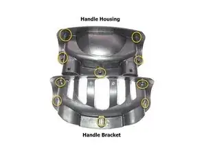 Установите верхний кронштейн ручки обратно поверх пластикового кожуха и убедитесь, что отверстия для винтов кронштейна совпадают со штырями на кожухе ручки.