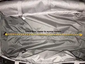 Внизу основного отделения разомкните молнию подкладки, чтобы обнажить корпус ручки внутри отсека подкладки.