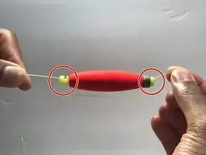 Повторите шаг два для противоположного конца поплавка, продев леску через второй крючок.
