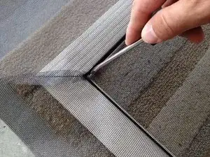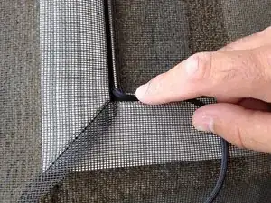 Используйте выпуклую (заострённую) кромку инструмента для вдавливания сетки, чтобы аккуратно вдавить сетку в канал рамы вдоль верхней части рамы. Это создаст борозду для вставки шнура-уплотнителя.