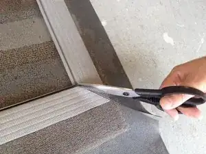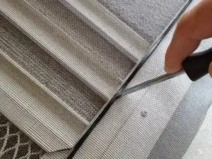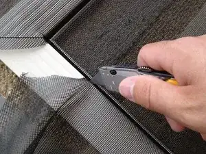 Режьте только до угла канала рамы. Не допускайте случайного прокола новой сетки.