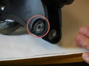 Вставьте винты обратно через пластиковые шайбы и колесо.