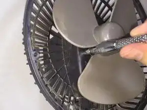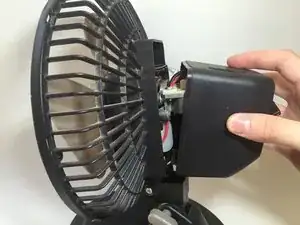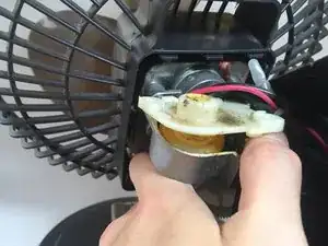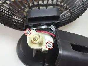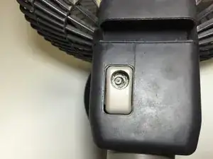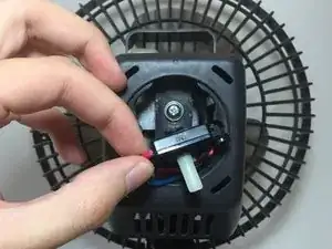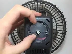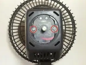 На верхней части вентилятора находится винт, фиксирующий кнопку маятникового движения к зубчатой передаче внутри корпуса. Удалите этот винт крестовой отверткой Phillips #0.