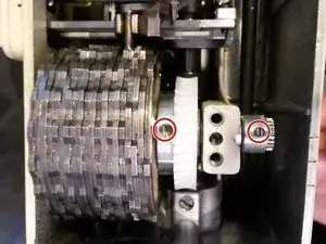 Ослабьте два винта, скрепляющих шестерню и кулачковый узел, чтобы винты можно было вынуть. Оставьте винты в отверстиях, чтобы сохранить взаимное положение деталей.