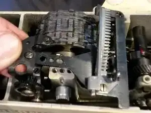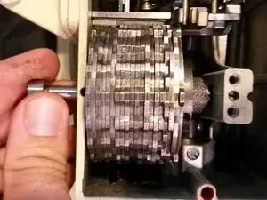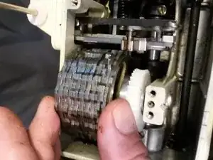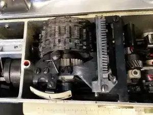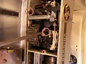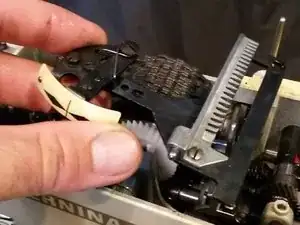 Указатель иглы (белый с чёрными ромбами) опирается на рычаг, касающийся чёрной шестерни, который приводится от маленькой шестерни, установленной ранее. Убедитесь, что этот рычаг поднят и касается чёрной шестерни.