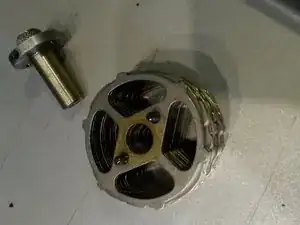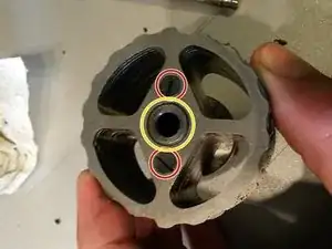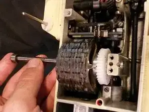 Выдавите вал шестерни пальцами или отверткой, чтобы сдвинуть его наружу. Возможно, потребуется использовать две отвертки, чтобы поддеть его.