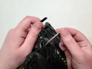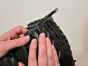 Вставьте шнур обратно в иглу и протолкните её через нижнее отверстие на мизинце.