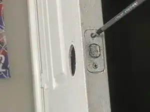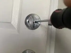 Используйте отвертку Phillips #1, чтобы удалить два винта, удерживающих внутренние и внешние половины дверной ручки вместе.