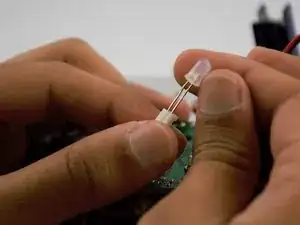 Для установки нового светодиода убедитесь, что длинный металлический вывод (положительный) подключён к красному проводу на разъёме (положительный). Короткий вывод (отрицательный) должен быть подключён к чёрному проводу (отрицательный).