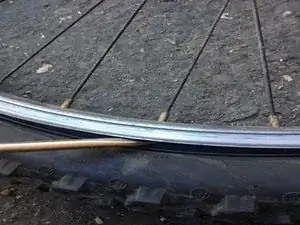 Вставьте плоскую отвертку или другой прочный длинный предмет между кромкой шины и ободом колеса.