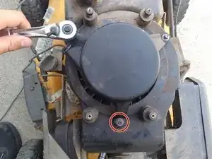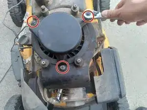 С помощью ключа открутите три гайки с неисправного стартера газонокосилки.