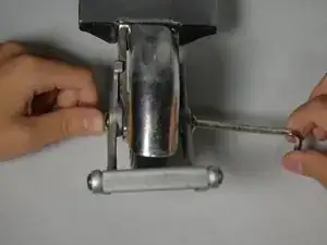 Смотрев на стойку для выполнения колесного виража, как показано, поместите ваш левый большой палец на болт, расположенный с левой стороны заднего колеса, и поместите шестигранный ключ в винт с правой стороны заднего колеса.