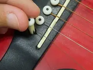 Вставьте штифт моста обратно в отверстие. Потяните за остальную часть струны, чтобы убедиться, что она натянута.