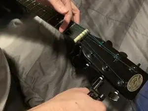 С помощью ножа для струн отрежьте струну под грифом гитары.