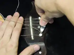 Вставьте одновременно струну и мостовой штифт обратно в отверстие (убедитесь, что желобок обращён к струне), затем, когда они окажутся на месте, нажмите небольшим усилием большим пальцем, пока не услышите щелчок.