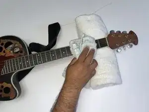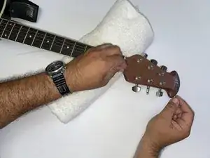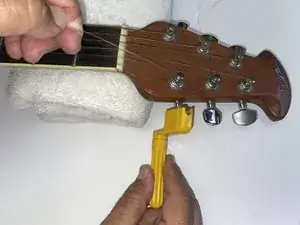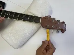 Положите гриф на приподнятую поверхность (например, свернутые полотенца или подушку). Ослабьте струну с помощью крутилки до тех пор, пока её не станет можно вытащить вручную.