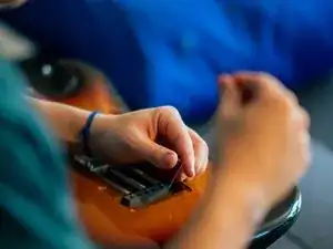В этом руководстве мы используем электрогитарные струны «Super Slinky» калибра 9-42. Вы можете использовать струны по своему выбору, убедившись, что в пачке есть все 6 струн.