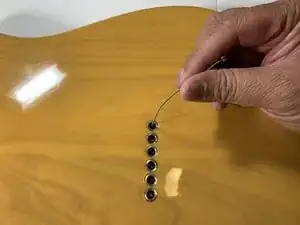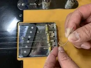 Протяните конец струны через мост и выведите его через заднюю часть корпуса гитары.