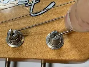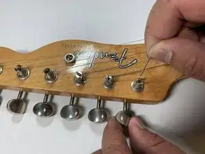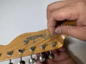 Продавливайте конец струны до упора и загните струну так, чтобы внешний сегмент касался поверхности головки грифа.