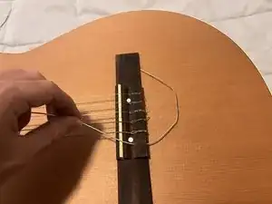 Следите за узлом на подставке при натяжении струны. Если он ненадёжен, он может развязаться. В этом случае это может привести к царапинам на гитаре.