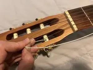 Проденьте другой конец новой струны в отверстие колка на головке грифа.