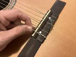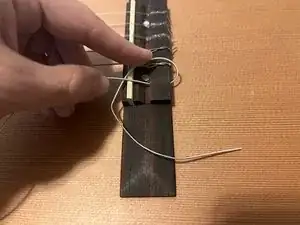 Проденьте новую струну через отверстие в подставке, оставив примерно 10–12 см запаса для завязывания узла.