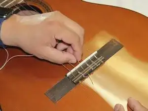 Прижмите узел на подставке пальцами и потяните длинный конец струны левой рукой, чтобы затянуть узел.
