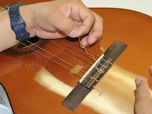 Снимите старую струну с подставки, развязав узел и вытянув её из отверстия подставки.