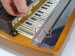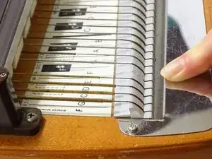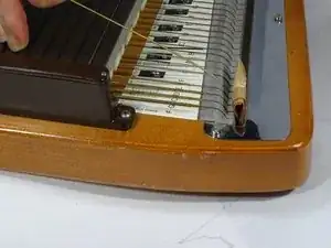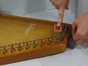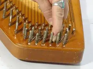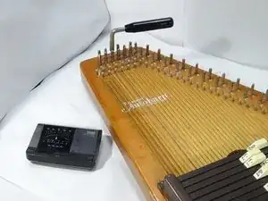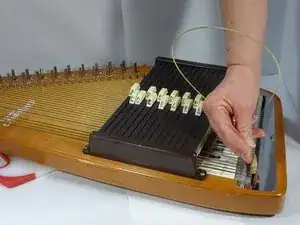 Это автогарпа Oscar Schmidt Educator Series. Существуют два типа струн для автогарп. Эта модель использует струны типа B с шариковым концом. Моя струна низкого октава E отсутствует.