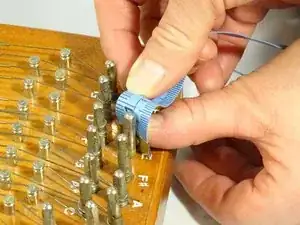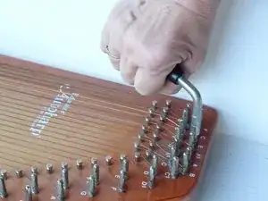 Струна должна быть натянута. Теперь вы готовы настраивать автогарпу. Используйте электронный тюнер и доведите натяжение до нужной высоты тона. Регулируйте высоту тона, поворачивая молоток для настройки малыми шагами. Поворачивайте против часовой стрелки (влево), чтобы понизить тон, и по часовой стрелке (вправо), чтобы повысить тон.