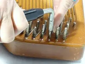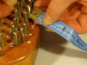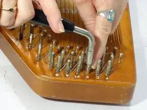 С помощью молотка для настройки отрегулируйте высоту колка до 15/16”. Если колок слишком низко, он будет срезан при установке новой струны. Регулируйте, поворачивая против часовой стрелки (влево) для подъёма колка или по часовой стрелке (вправо) для его опускания.