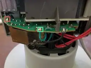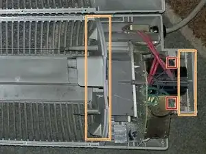 Если посмотреть на меньшую нижнюю плату, вы заметите по 2 провода с каждой стороны. Немного выше может быть термоклей, фиксирующий эти провода к пластиковому корпусу. На фото это не видно, но примерное расположение выделено красным. Удалите этот и любой другой термоклей, удерживающий основной силовой кабель.