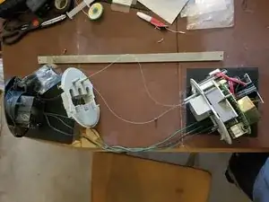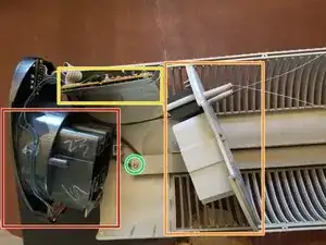 Не растягивайте серую пластиковую деталь. Она всё ещё соединена с нижней электроникой двумя статическими проводами. НЕ ПЕРЕРАСТЯГИВАЙТЕ эти провода.
