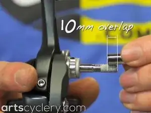 Снимите гайку анкера тормоза и вставьте тормоз в вилку до упора. Убедитесь, что колодки свободно проходят вдоль лопастей вилки.