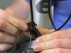 Удерживайте тормоз закрытым одной рукой и зажимайте трос другой, используя шестигранник 5 мм.