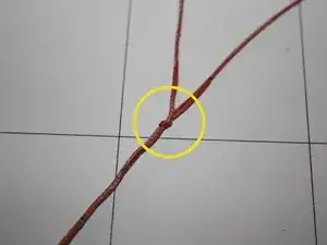 После того как линия вытянута через петлю красной линии, протяните красную линию через петлю жёлтой линии с той стороны, которая идёт дальше к крылу, чтобы извлечь её из жёлтой.
