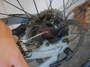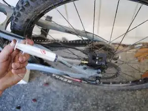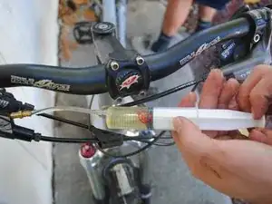 Вкрутите наполненный шприц в порт на суппорте сзади велосипеда, как показано на первой фотографии.