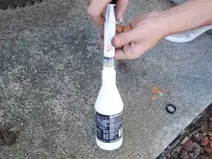 Удалите воздух из шприца, держа его вертикально, постукивая по нему пальцем и нажимая на поршень до тех пор, пока из него не начнёт выходить тормозная жидкость.