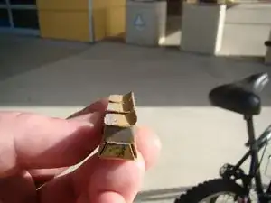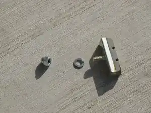 Гайка с полукруглой головкой (слева), стопорная шайба (по центру) и тормозная колодка (справа).