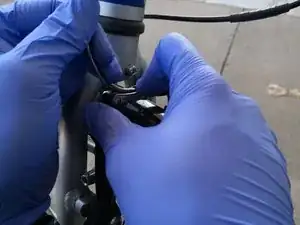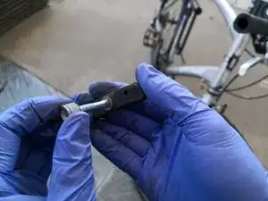 Поставьте быстроразъёмный механизм обратно, зажав обе стороны опоры и вставив механизм в металлическую трубку рядом с трубкой.