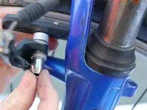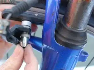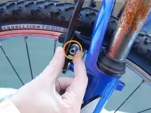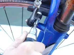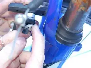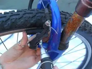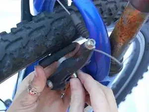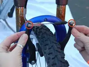 Найдите тормозные суппорты. Сожмите суппорты вместе, чтобы снять натяжение тормоза. Отцепите тормозной трос от металлической втулки левой рукой.