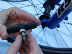 Проденьте болт через продольное отверстие в суппорте так, чтобы тормозная колодка была направлена к центральной линии велосипеда.