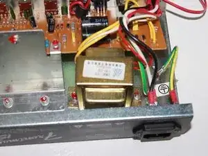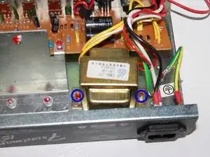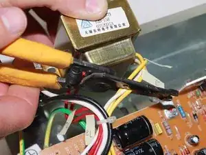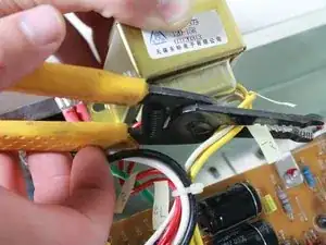 Хотя трансформатор освобожден от кронштейна, его нельзя полностью снять, поскольку к плате по-прежнему подсоединены кабели, которые необходимо перерезать.