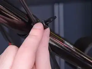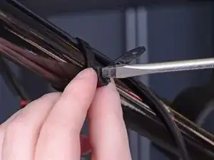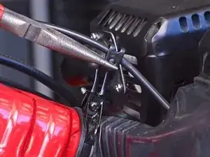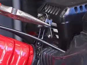Вставьте плоскую отвёртку между защёлкой и концом стяжки, фиксирующей трос газа к рулю.