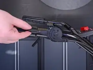 Крышка воздушного фильтра всё ещё будет прикреплена к мотоблоку гибким шлангом. Вы можете отодвинуть крышку в сторону, чтобы продолжить работу, или выполнить следующие два шага, чтобы полностью снять крышку.