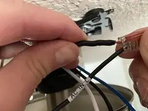 Подключите чёрный провод, обозначенный AC_IN L, от приемника к чёрному (фазному/питающему) проводу из потолочной распределительной коробки.