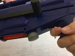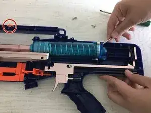 Оранжевый зуб планки Nerf и соответствующая пружина могут выскочить во время ремонта. Если это произойдёт, аккуратно отложите их в сторону и не забудьте установить при сборке.
