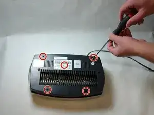 Найдите все пять винтов корпуса и выньте их с помощью крестовой отвертки. Винты находятся в пяти отмеченных кружках на фото. Длина винтов составляет 18 мм, а диаметр головы — 5 мм.
