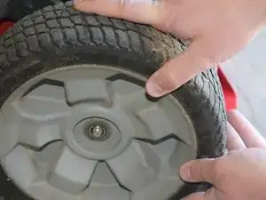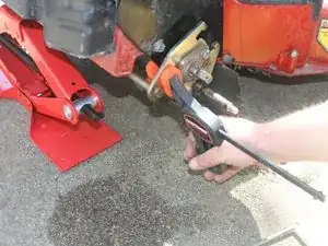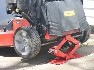 Подоприте заднюю часть газонокосилки с помощью опорной стойки, домкрата-ножницы или другой устойчивой подставки. Оба задних колеса должны быть оторваны от земли.